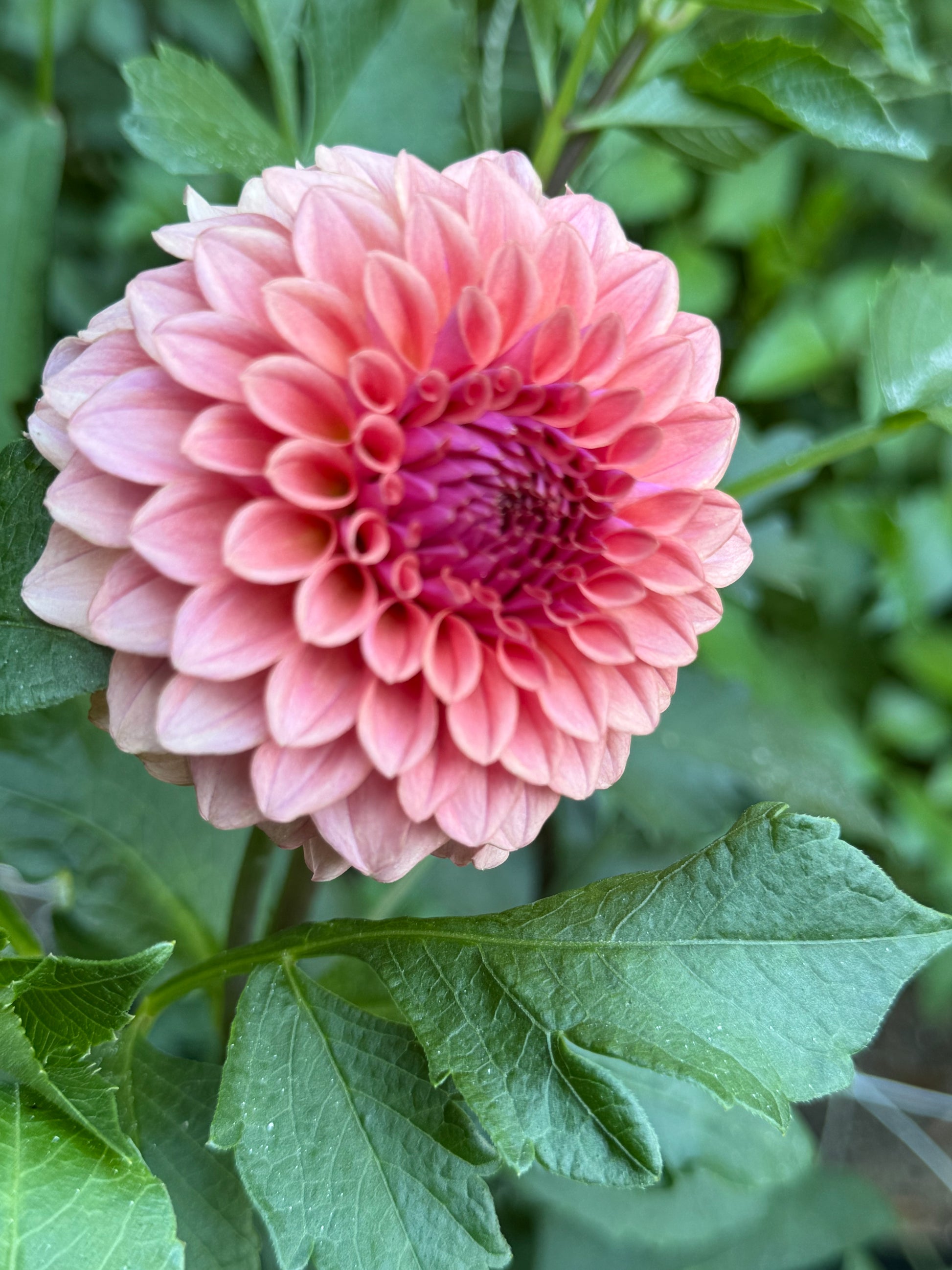 Levi’s Blue Smoke was a 2024 intro by Levi Tremblay. This dahlia is a gorgeous peachy pink with a raspberry toned center on strong stems, it is a prolific bloomer.